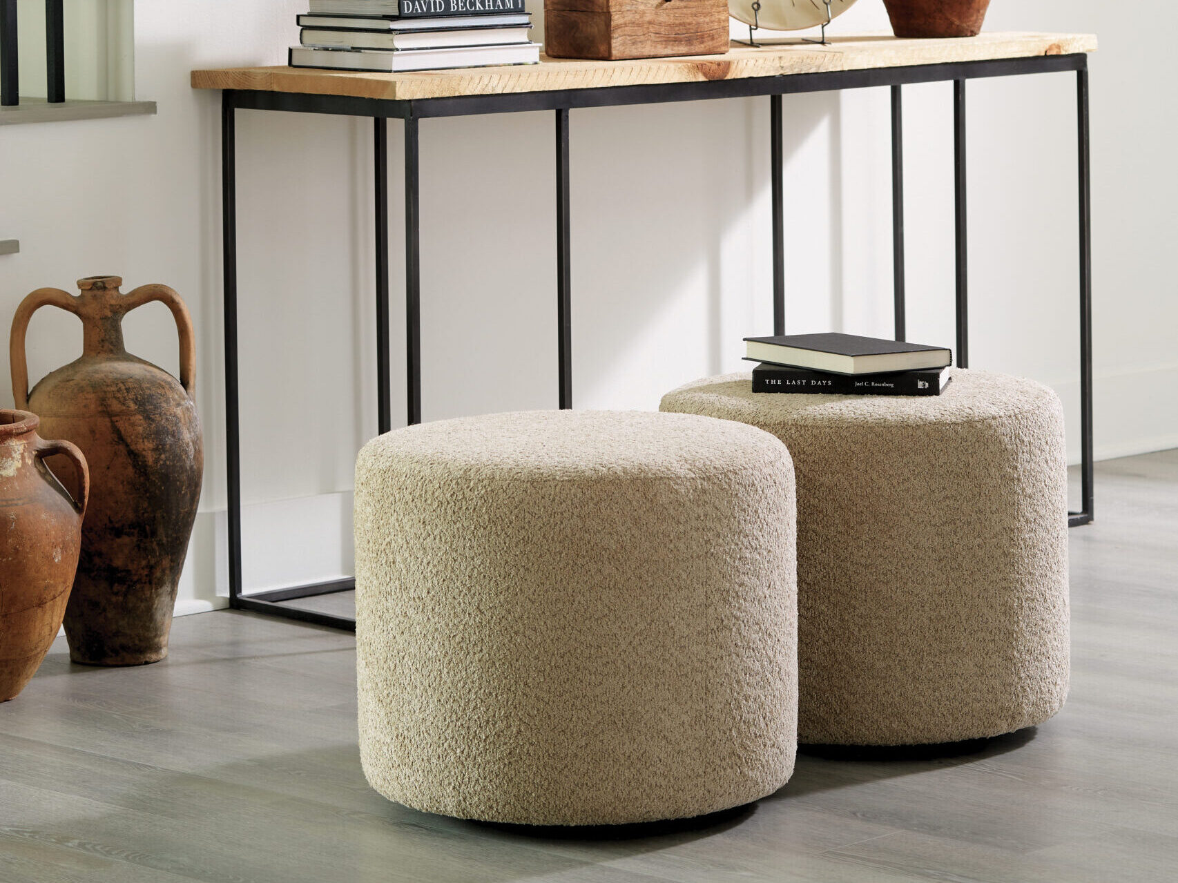 Round Ottomans add a touch of style and versatility to any living room, serving as a cozy footrest, additional seating, or a chic accent piece. Their circular design softens the look of a space, making them a popular choice for adding curves and comfort in a variety of fabric and color options to suit any decor.
