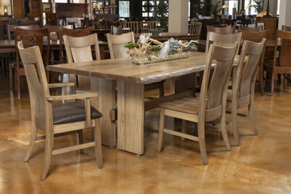 The Sable Table brings a rustic, natural charm to your dining room with its striking live edge design. Crafted to highlight the unique character of solid American hardwood, this table is available in a range of top thicknesses—from 1″ up to a bold 1.75″—and can be customized with up to four 12″ leaves for extra seating. Select models offer convenient self-storage for leaves, making it easy to adapt your table for gatherings of any size.